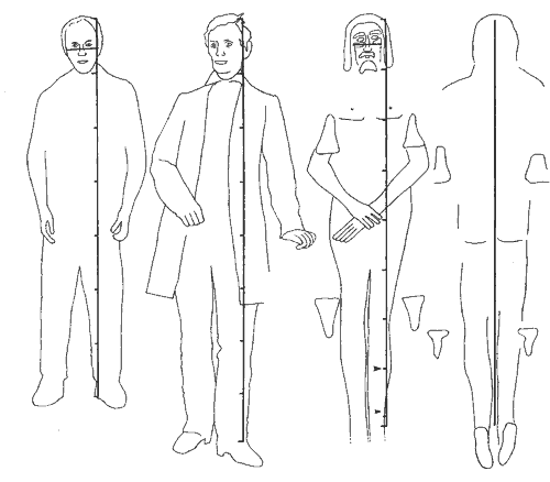 Same scale comparison of the shroud figure to a typically proportioned male and Abraham Lincoln (all traced from large scale photographs, scorch marks on shroud are included as landmarks). Total height, head height, and head breadth in mm measured by bars are typical man (1730, 245, 150), shroud figure (1860, 225, 130), Lincoln (1920, 245)—because the typical man is balding less hair was deleted from the height, the hair of Lincoln is also matted down somewhat and he was wearing deep heeled shoes that were deleted from his height (averaged between the two feet). Short horizontal bars on total height bars indicate total/head height ratios, larger arrow for shroud figure indicates total height if its ratio were typical, smaller arrow is total height if the ratio were as high as Lincoln's. Note that the heads of the typical man and Lincoln are similar in size to one another despite their great divergence in total height, and both of their heads are significantly taller and broader than that of the shroud figure whose forehead is much shallower. NOTEFor photos of the shroud, see: Full length photo of the Shroud of Turin and Full length negatives of the Shroud of Turin at Wikipedia. Interested in publishing on the Secular Web? See the Submission Guidelines & Instructions.